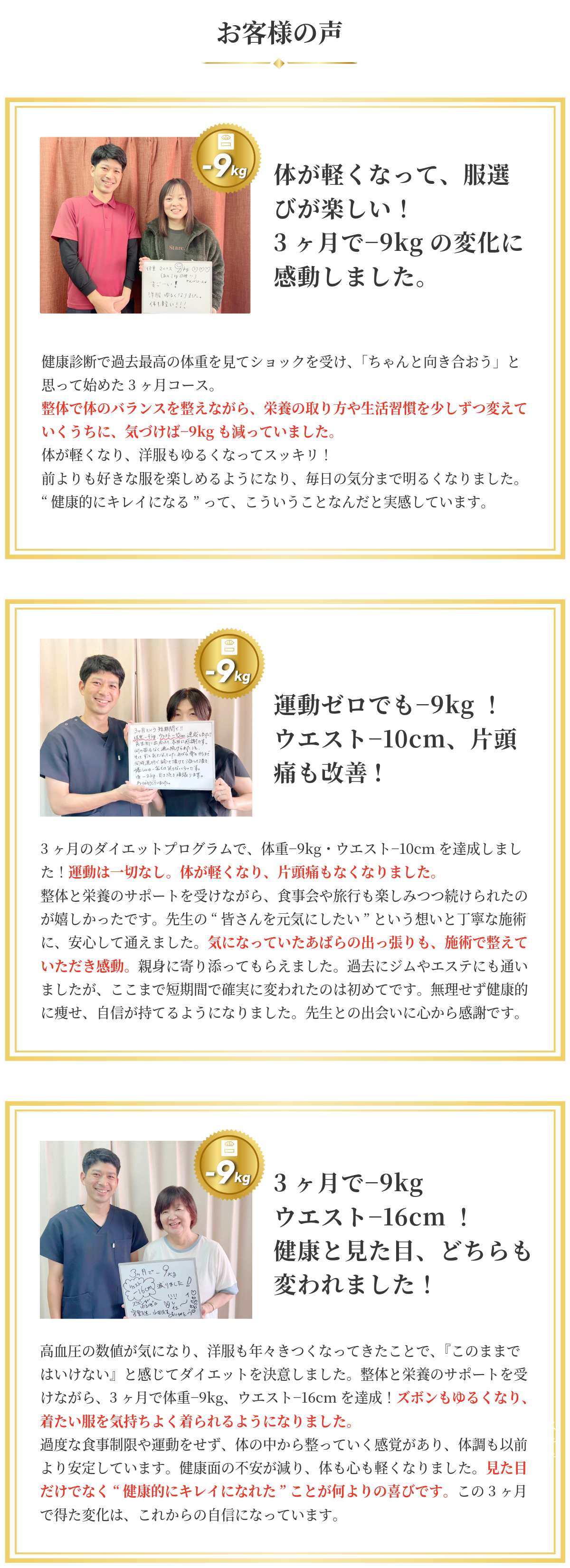 ダイエットを諦めていた方、何をやっても変わらなかった方の最後の砦となれるよう、お一人お一人に真剣に向き合っていきます。